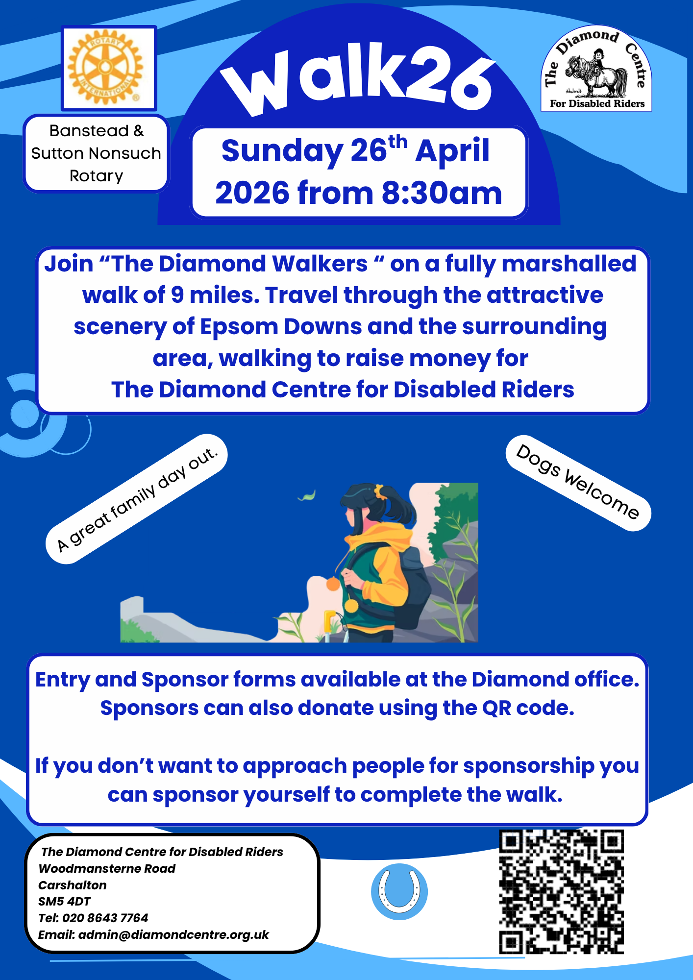 Join “The Diamond Walkers ” on a fully marshalled walk of 9 miles. Travel through the attractive scenery of Epsom Downs and the surrounding area, walking to raise money for The Diamond Centre for Disabled Riders